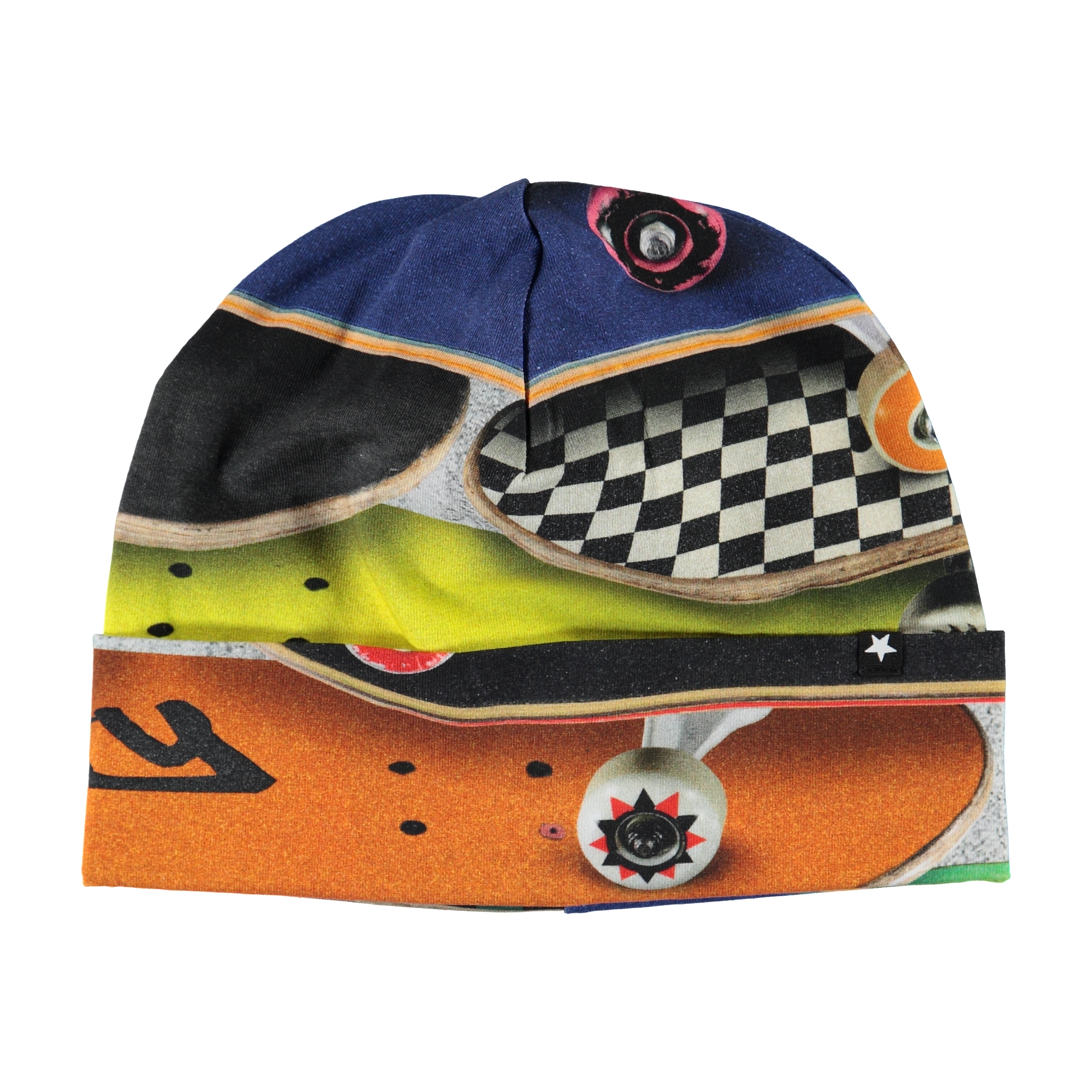 Mössa med tryck av skateboards. Mössan har uppvik.