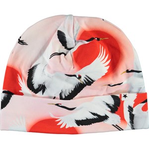 Mjuk och elastisk rosa dubbelsidig mössa med flygande tranor. Mössan har en kant som kan användas både uppvikt och nedvikt.