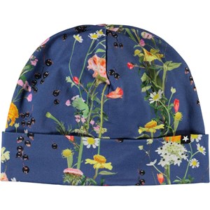Mjuk och elastisk dubbelsidig blå mössa med blommönster. Mössan kan användas med och utan uppvikning.