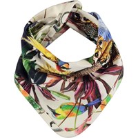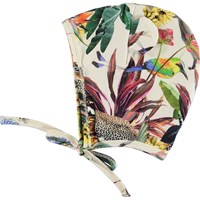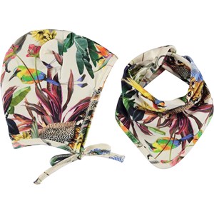 Hjälmmössa och dregglis i vit med en färgrik fantasidjungel. Mössan kan knytas tätt intill ansiktet med snören under hakan. Dessutom har mössan påsydda små öron. Dregglisen stängs med tryckknapp bak i nacken.