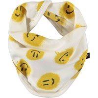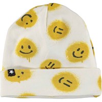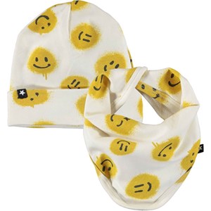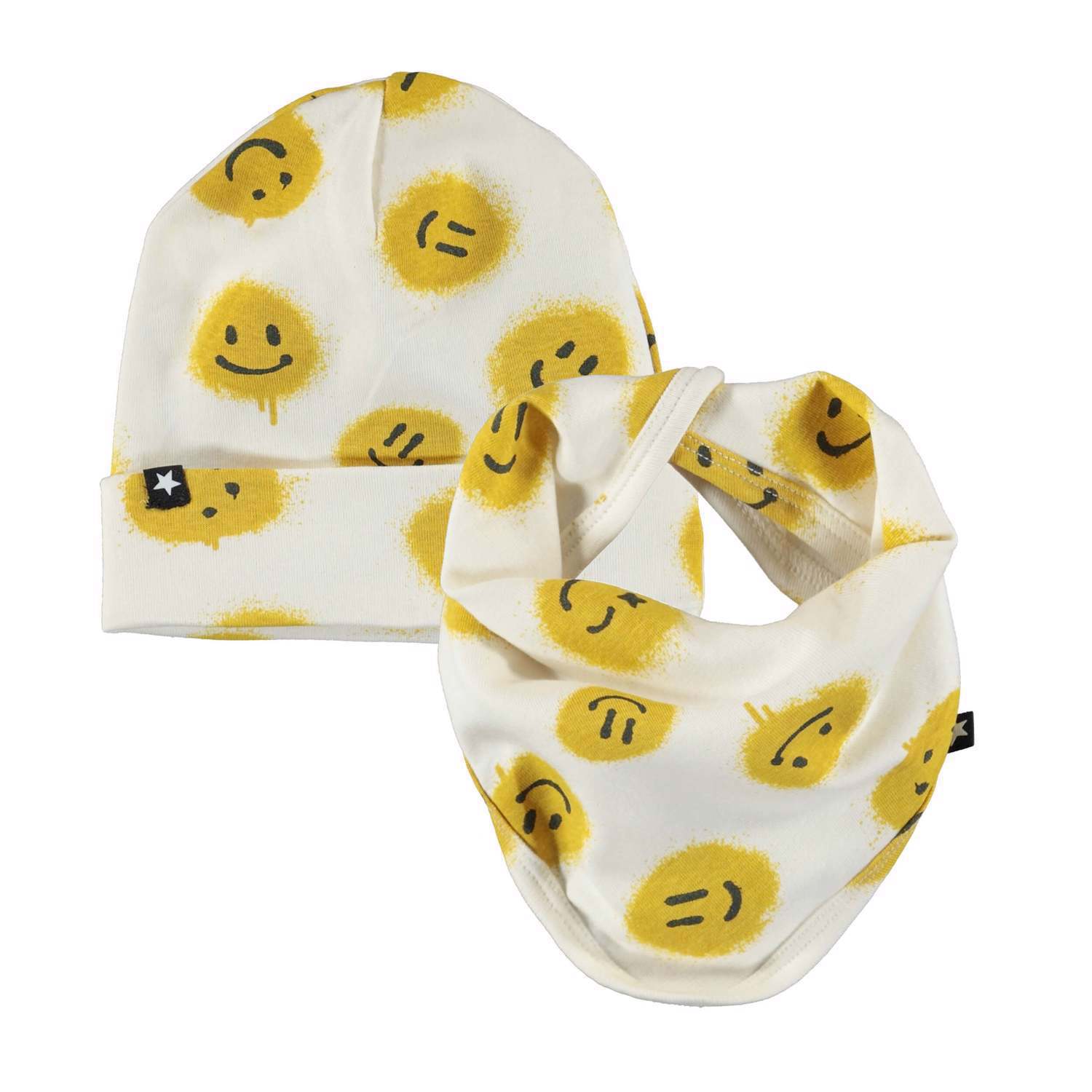Babymössa och dregglis i ljus cremefärg med spraymålade smileys. Dregglisen stängs med tryckknapp bak i nacken.