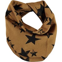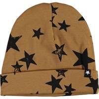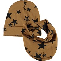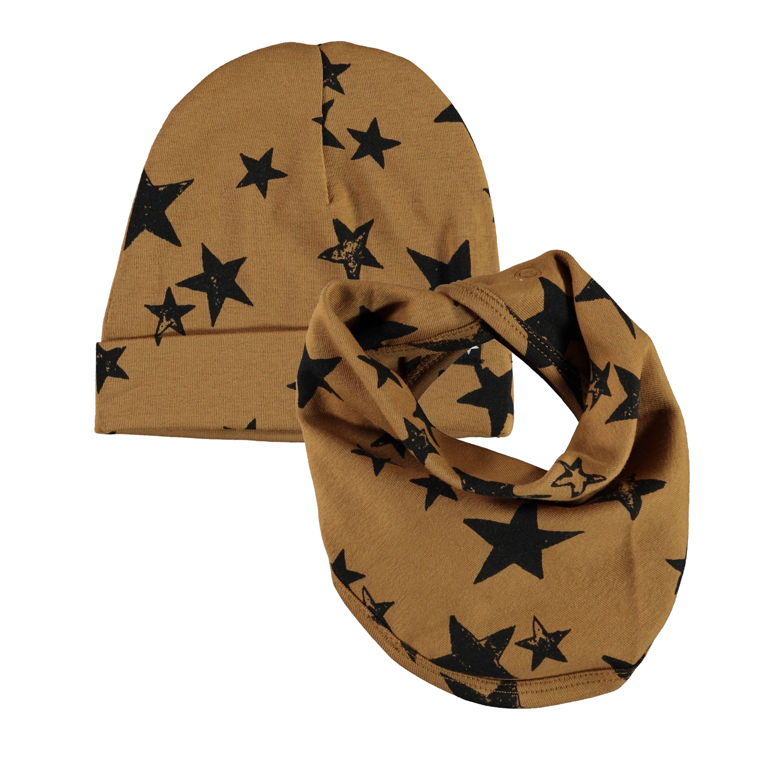 Babymössa och hakklapp i brun med stjärnor. Hakklappen stängs med tryckknapp bak i nacken.