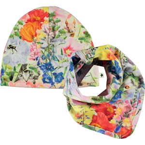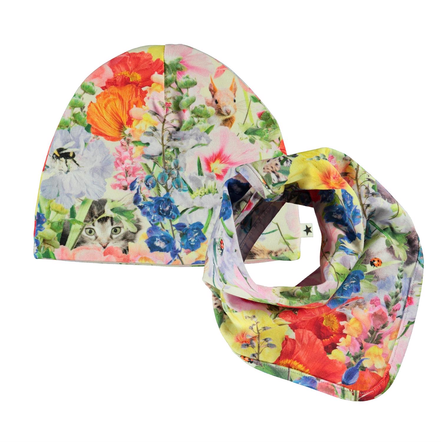 Babymössa och haklapp med blommor. Haklappen stängs med en tryckknapp i nacken.