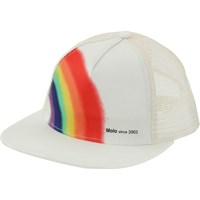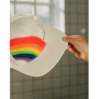 Här är en vit keps med en regnbåge framtill. Kepsen justeras bak i nacken.