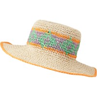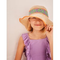 Lätt stråhatt med bred skärm och orange kant och ett integrerat band i lila, orange och grön. Perfekt till att ge skugga under solens varma strålar.