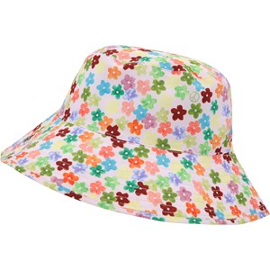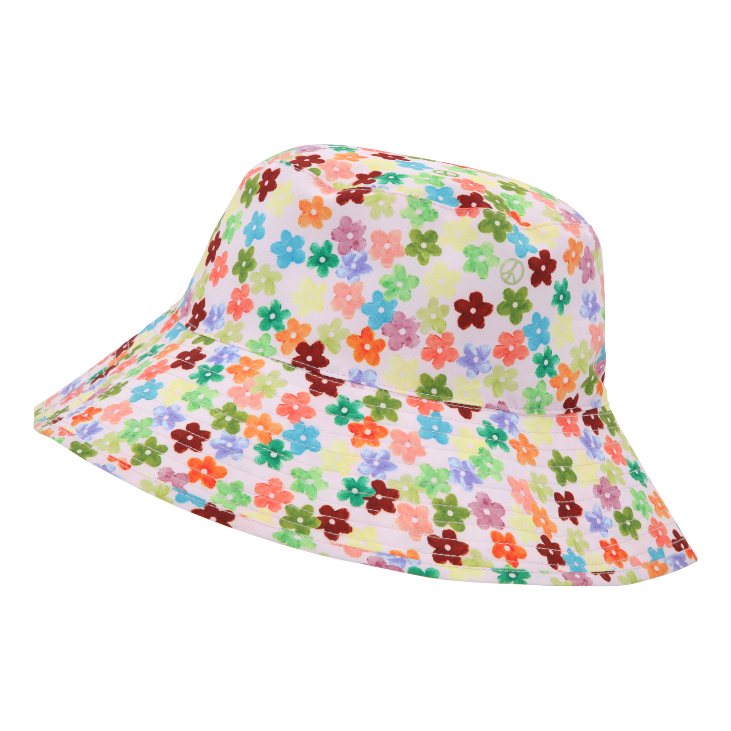 Buckethatt med bred kant och multifärgat mönster i 100% polyester. Mönstret består av akvarellmålade blommor i olika färger, och tittar men extra noga, kan man kanske hitta ett. peacetecken eller två. Den breda kanten är perfekt för att ge extra skydd i solen.