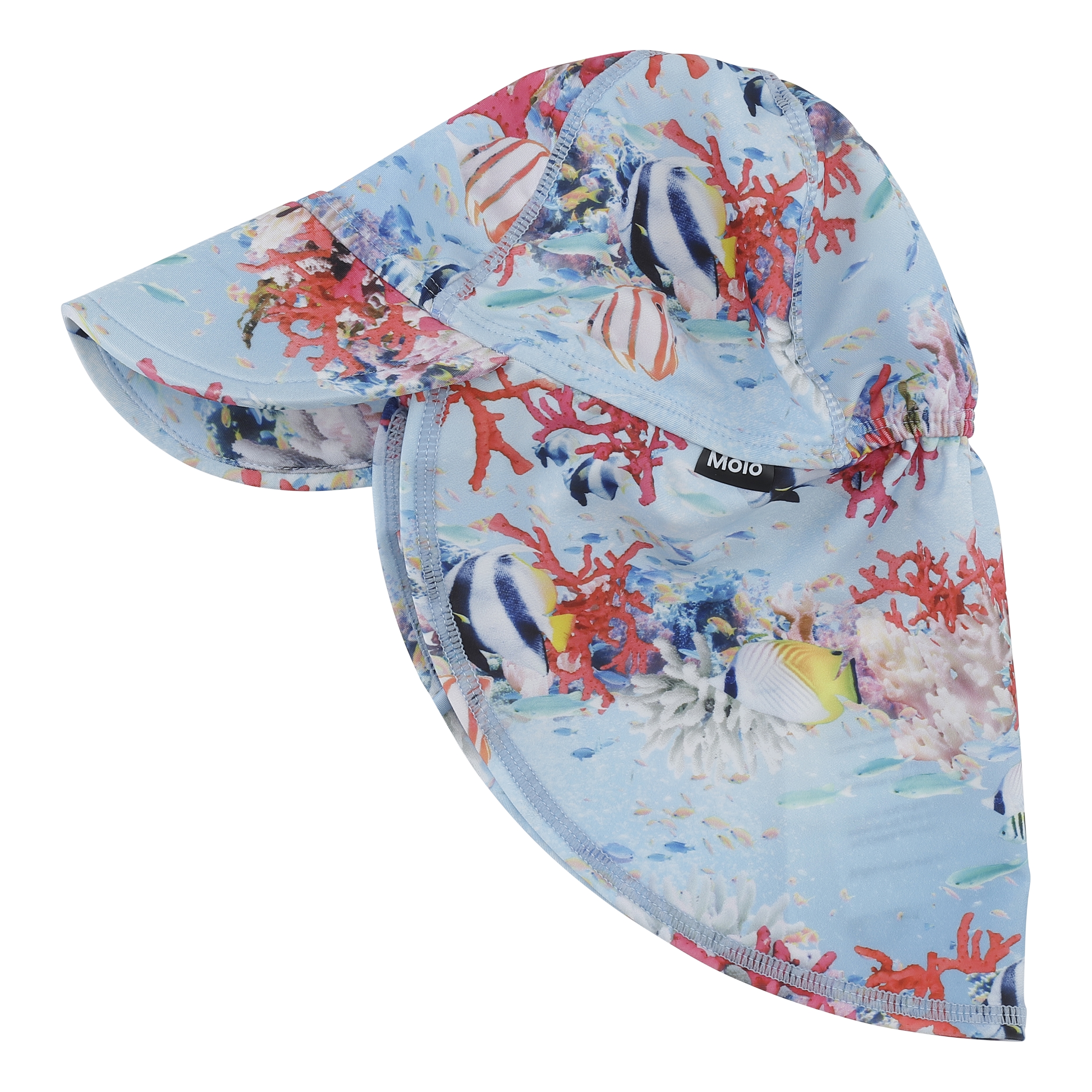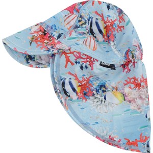 Solhatt med UV skyddsfaktor 50+, bred skärm och nackskydd som ger ett effektivt skydd till ditt barns mest utsatta områden. Solhatten är dekorerad med trycket 'Coral Stripe'.