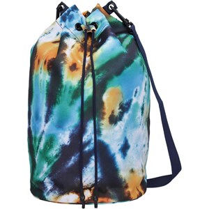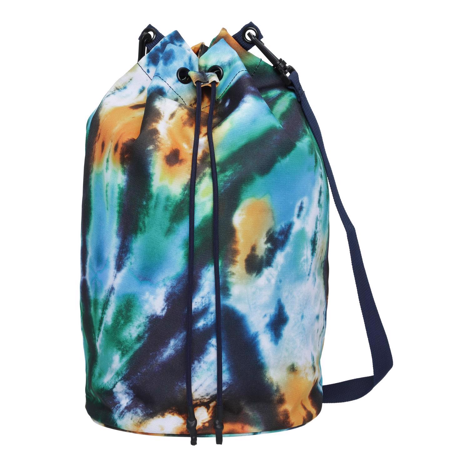 Stor vattenavvisande väska med tie-dye mönster. Väskan har snören som dras ihop i toppen och ett axelband. Väskan är perfekt för en dag på stranden.