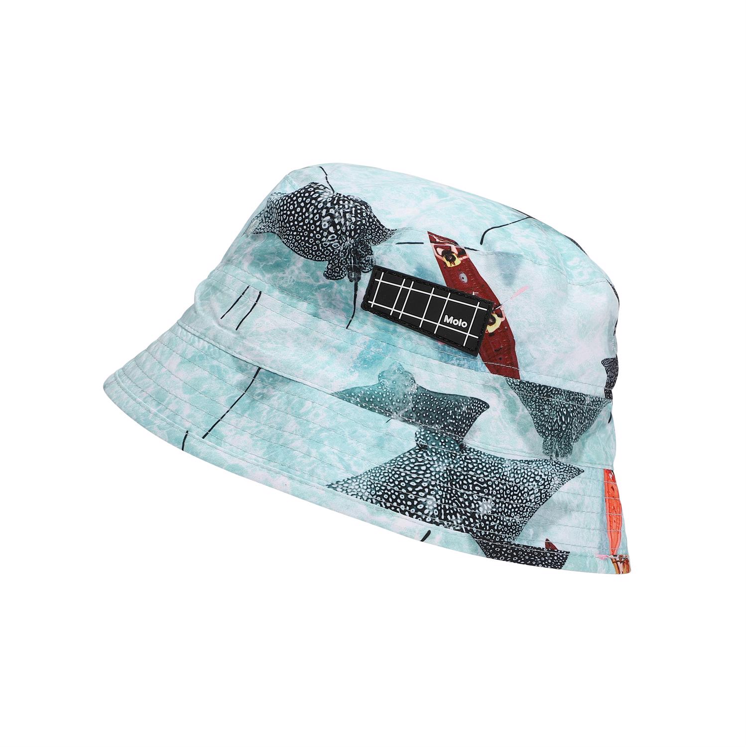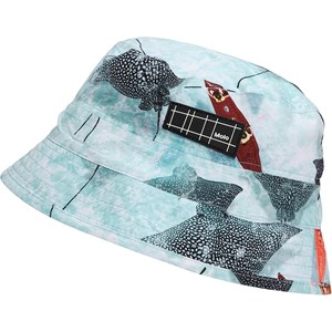 Bucket hat med smal kant och UV-skydd 50+, som skyddar barnet från solen. Molos bucket hat är en perfekt sommar-accessoar, som livar upp varje outfit. Solhatten har ett tryck av rockor som simmar i havet. Denna Molo-produkt är återvunnen och tillverkad av REPREVE återvinningsbar polyester. REPREVE är det ledande och mest erkända materialet i återvinningsbara fibrer och tillverkas av använda plastflaskor och annat restavfall. Produktionen av återvunnen polyester kräver mycket färre resurser och avger mindre koldioxid. Därför är Molos återvunna badkläder det hållbara valet.