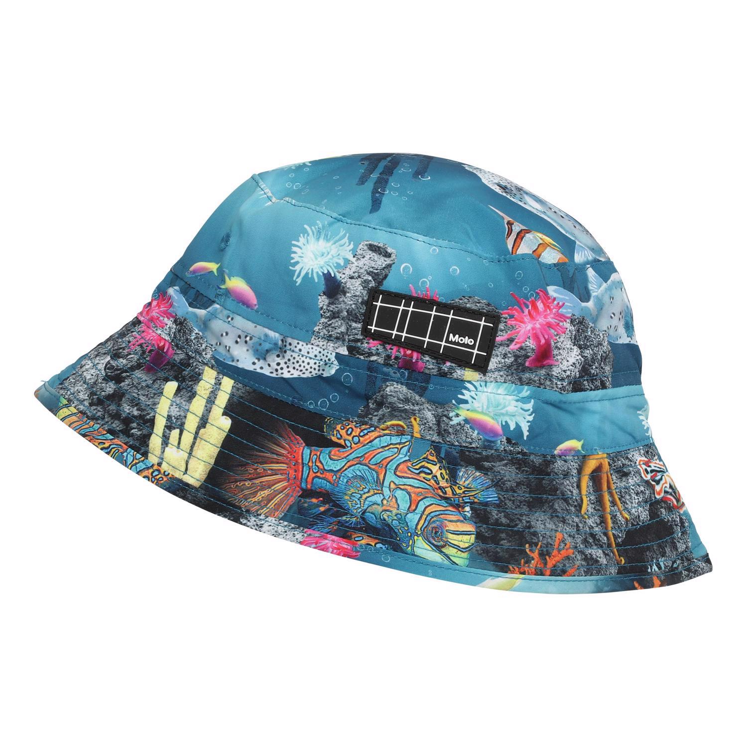 Bøllehat med smal skygge og UV beskyttelse 50+. Bøllehatten er et uundværligt sommer accessoires og liver et hvert outfit op. Her med print livet på havbunden med fisk og koraller.