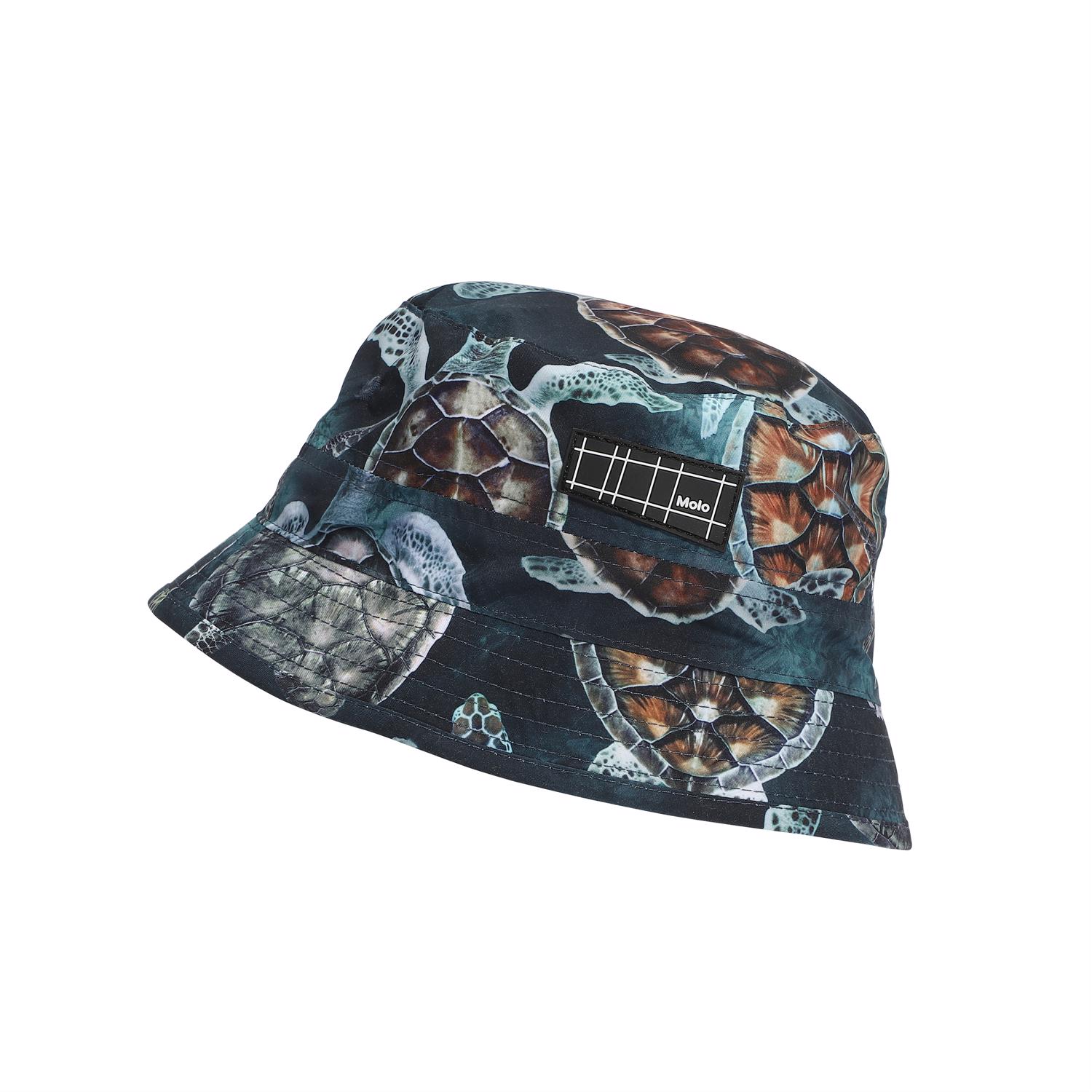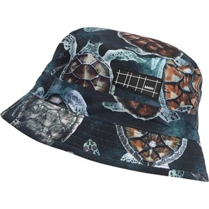 Bucket hat med smal kant och UV-skydd 50+, som skyddar barnet från solen. Molos bucket hat är en perfekt sommar-accessoar, som livar upp varje outfit. Solhatten har ett tryck av skölpaddor. Denna Molo-produkt är återvunnen och tillverkad av REPREVE återvinningsbar polyester. REPREVE är det ledande och mest erkända materialet i återvinningsbara fibrer och tillverkas av använda plastflaskor och annat restavfall. Produktionen av återvunnen polyester kräver mycket färre resurser och avger mindre koldioxid. Därför är Molos återvunna badkläder det hållbara valet.