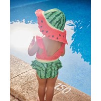 Stretchig solhatt för de små i återvunnen polyester med UV-skydd 50+. Solhatten har en vanlig passform, en smal elastisk snodd och en bred skärm som skyddar mot solens strålar. Solhatten har här ett mönster av en mogen vattenmelon.