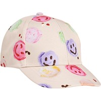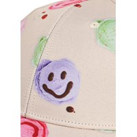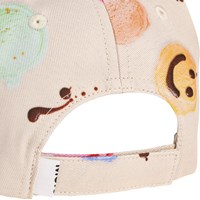 Gräddfärgad keps med glassmönster, bred skärm och justerbar kardborrefästning för optimal passform. Den är perfekt för strandutflykter och utomhuslek.