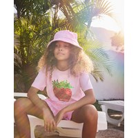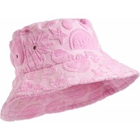 Rosa buckethatt i mjuk bomullsfrotté med ett mönster av exotiska frukter. Hatten har en vanlig passform med luft hål och finns i tre olika storlekar. Frotté torkar snabbt och är lämplig att använda vid vatten.