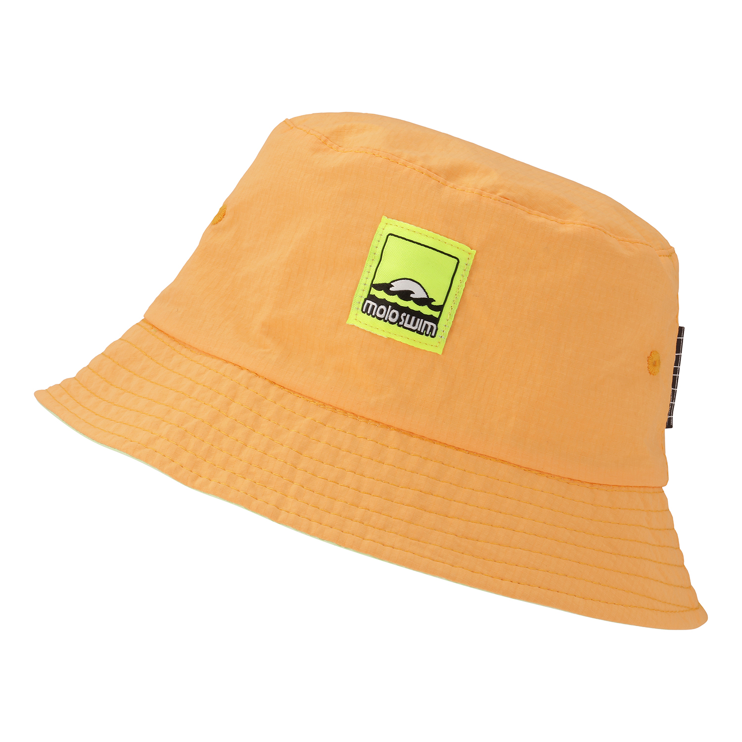 2-i-1 buckethatt tillverkad i nylon med neongult Molo Swim märke framtill. Hatten är vändbar och kan därför både vara orange och limegrön.