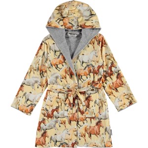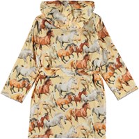 Ekologisk mjuk morgonrock med gallopperande hästar på ljusgul bakgrund. Morgonrocken är fodrad med en lätt, tät och mjuk frotté, har två fickor, knytband i midjan och en stor luva för att hålla nacke och huvud extra varmt.