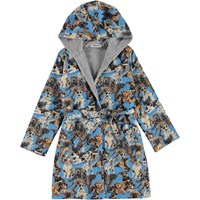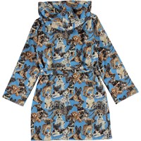 Ekologisk mjuk morgonrock med söta hundvalpar på blå bakgrund. Morgonrocken är fodrad med en lätt, tät och mjuk frotté, har två fickor, knytband i midjan och en stor luva för att hålla nacke och huvud extra varmt.