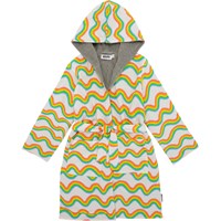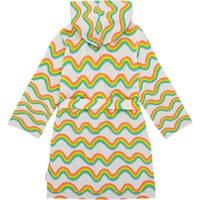 Mjuk morgonrock i ekologisk bomullsfrotté med regnbågsmönster. Morgonrocken grått foder, två fickor, knytband i midjan och luva.