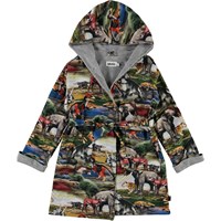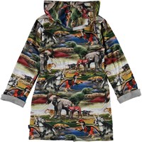 Mjuk badrock med dinosaurier på. Badrocken är fodrad med en tunn och mjuk frotté, har två fickor, ett knytband i midjan och en stor huva för att hålla nacken och huvudet extra varmt.