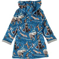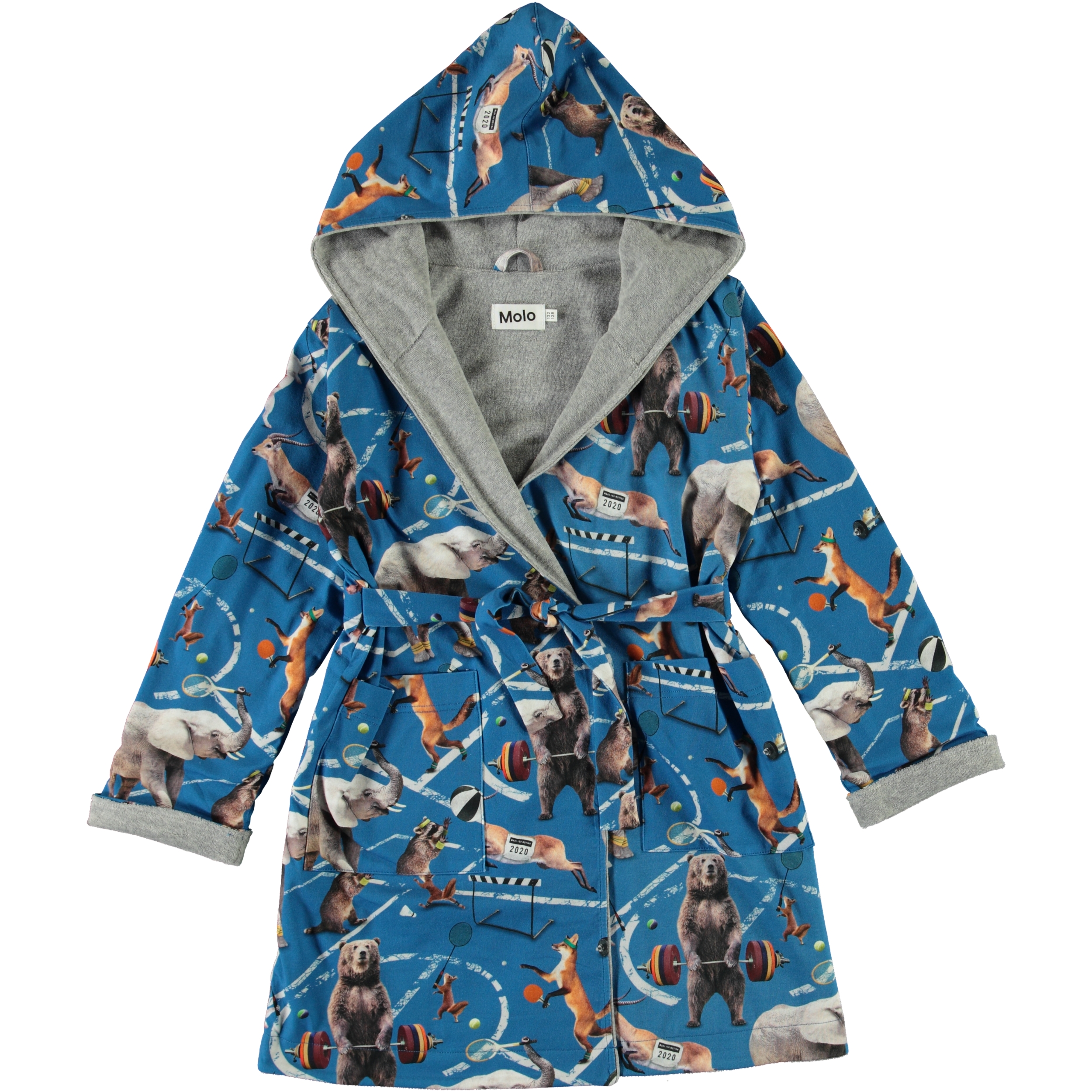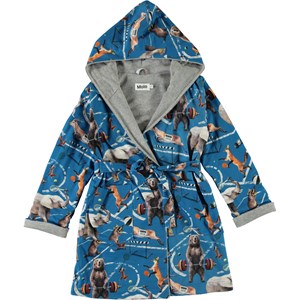 Ljusblå, mjuk badrock med ett print av djur som sportar. Badrocken är fodrad med en tunn och mjuk frotté. Den har två fickor, ett midjeband och en stor luva för att hålla huvudet extra varmt.