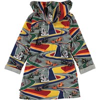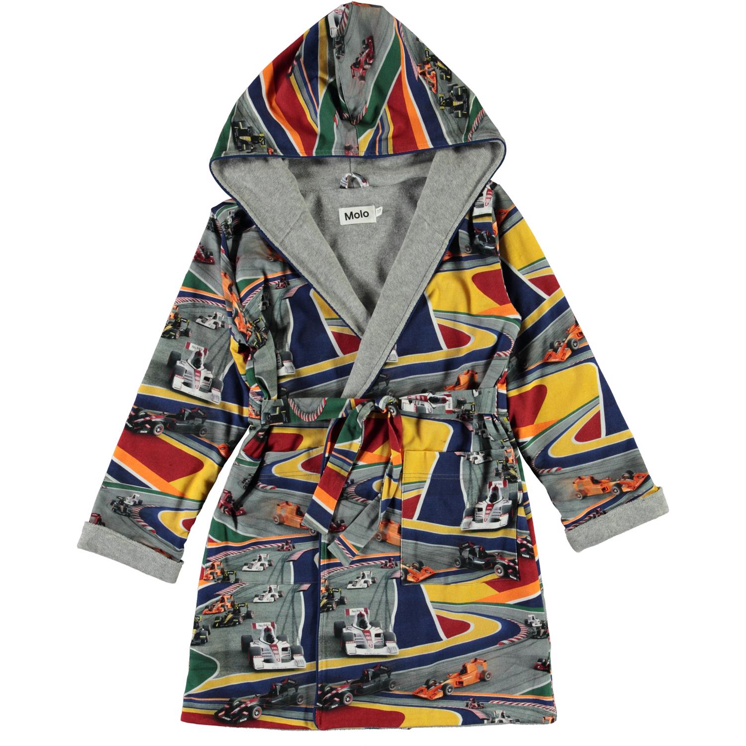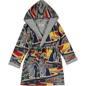 Mjuk badrock med ett färgglatt mönster av snabba racerbilar. Badrocken är fodrad med en tunn och mjuk frotté. Den har två fickor, ett midjeband samt en stor luva för att hålla huvudet varmt.