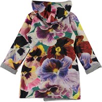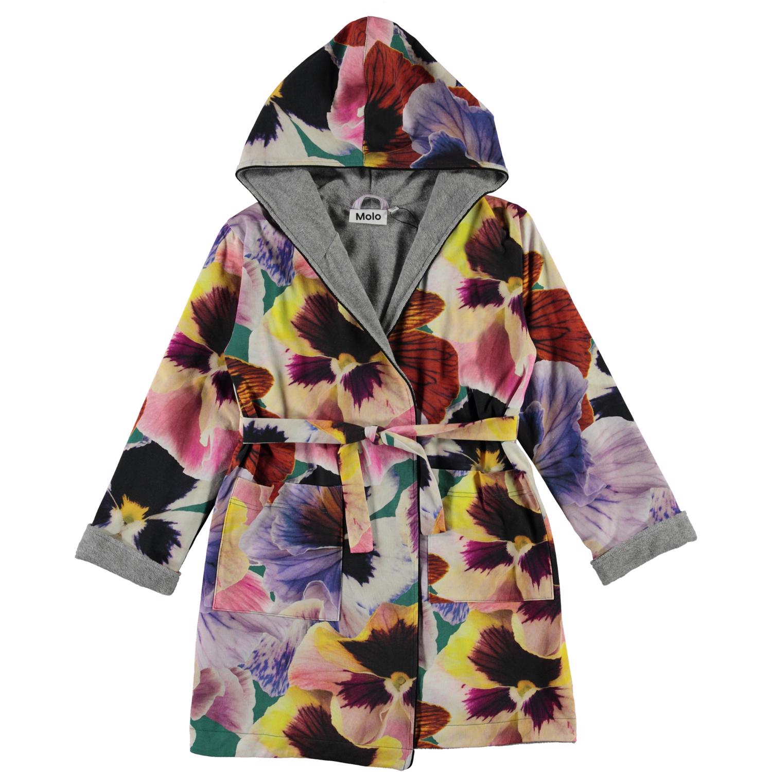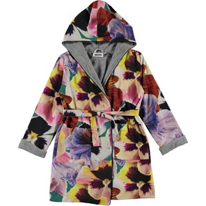 Mjuk badrock med tryck av stora blommor. Badrocken är fodrad med en tunn och mjuk frotté, har två fickor, ett band i midjan och en stor luva för att hålla nacken och huvudet extra varmt.