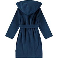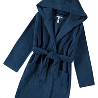 Mörkblå morgonrock gjord av supermjuk, ekologisk bomullsfrotté. Morgonrocken har två fickor, knyt i midjan och en huva.