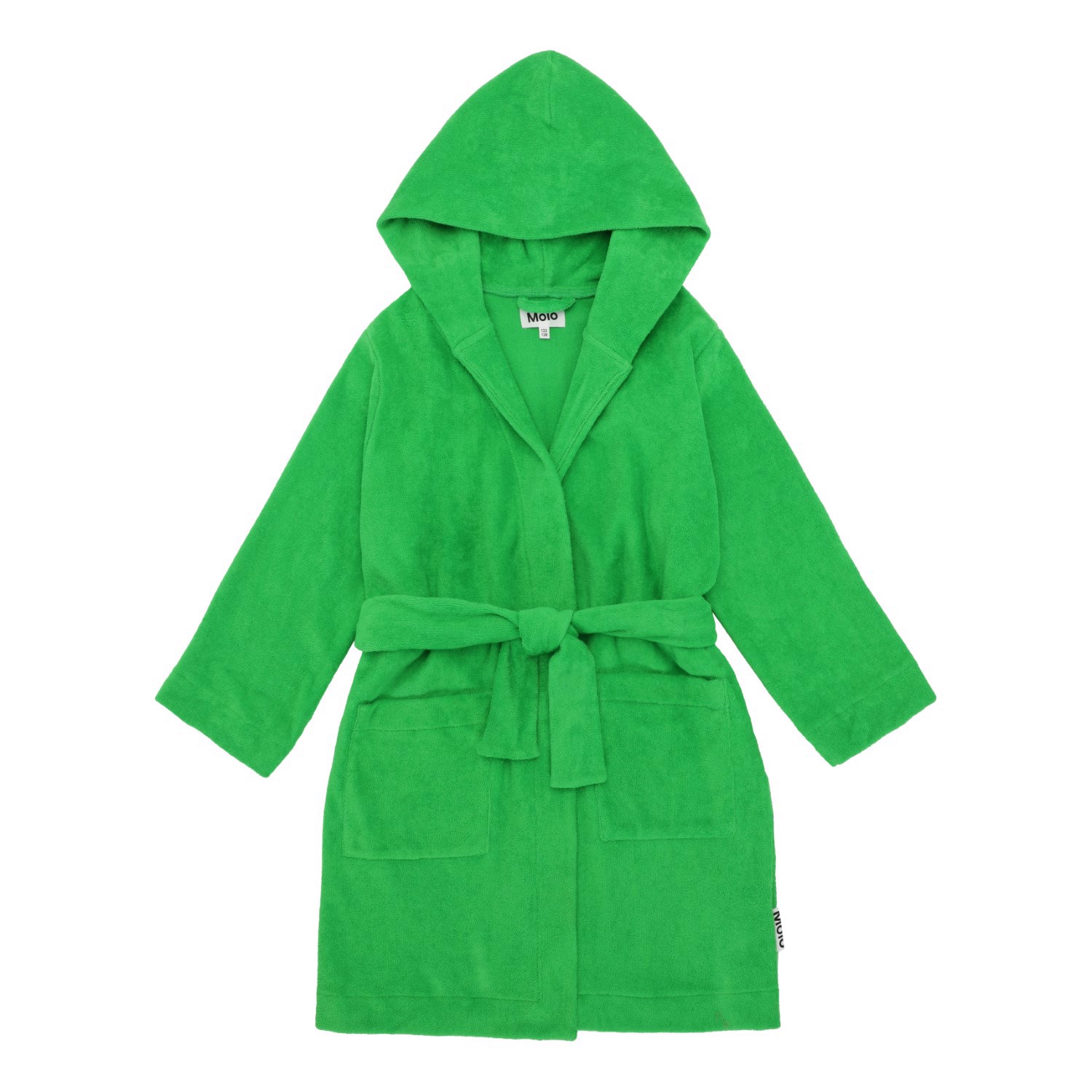 Grön morgonrock i en supermjuk, ekologisk bomullsfrotté. Morgonrocken har två fickor, knytband i midjan och luva.