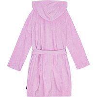 Rosa morgonrock tillverkad av supermjuk, ekologisk bomullsfrotté. Morgonrocken har två fickor, ett midjeband och en huva.