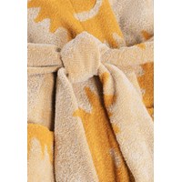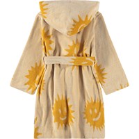 Beige badrock i mjuk, ekologisk bomullsfrotté med gult solmönster. Badrocken har en huva, knytskärp och två fickor. Den är perfekt efter badet eller för strandutflykten.