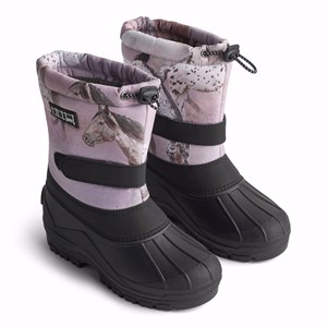 Praktiska vinterstövlar med en stadig och halkfri svart sula och ett tryck av hästar på en drömlik bakgrund i nyanser av rosa och lila. Stövlarna har en justerbar resår längst upp på skaftet, justerbart kardborreband runt ankeln, en innerstrumpa och en bra höjd, vilket gör dem lämpliga för alla slags väderförhållanden.