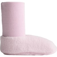 Lila babysockor i mjuk fleece-kvalitet av 100% merinoull. Sockorna har tätt åtsittande ribbkant med uppvik vid ankeln och en söt, broderad tassmotiv under foten.