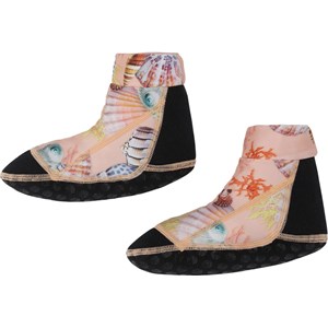 Neopren badesokker, som beskytter de små fødder mod skarpe genstande og varmt sand. Disse badesokker er med print af strandskaller på ferskenfarvet baggrund og sort bund.