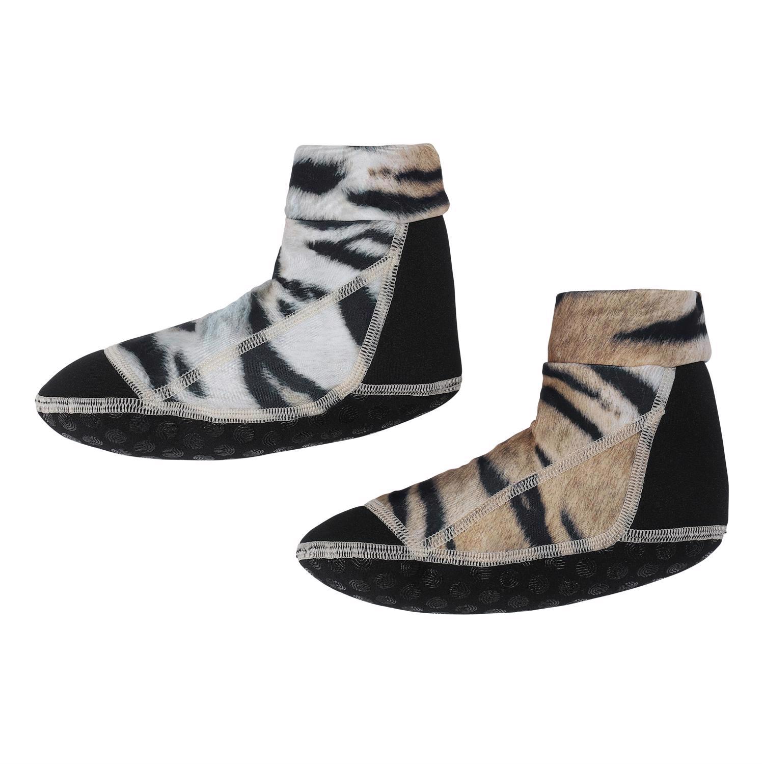 Neopren badesokker, som beskytter de små fødder mod skarpe genstande og varmt sand. Disse badesokker er med print af tigerstriber og sort bund.
