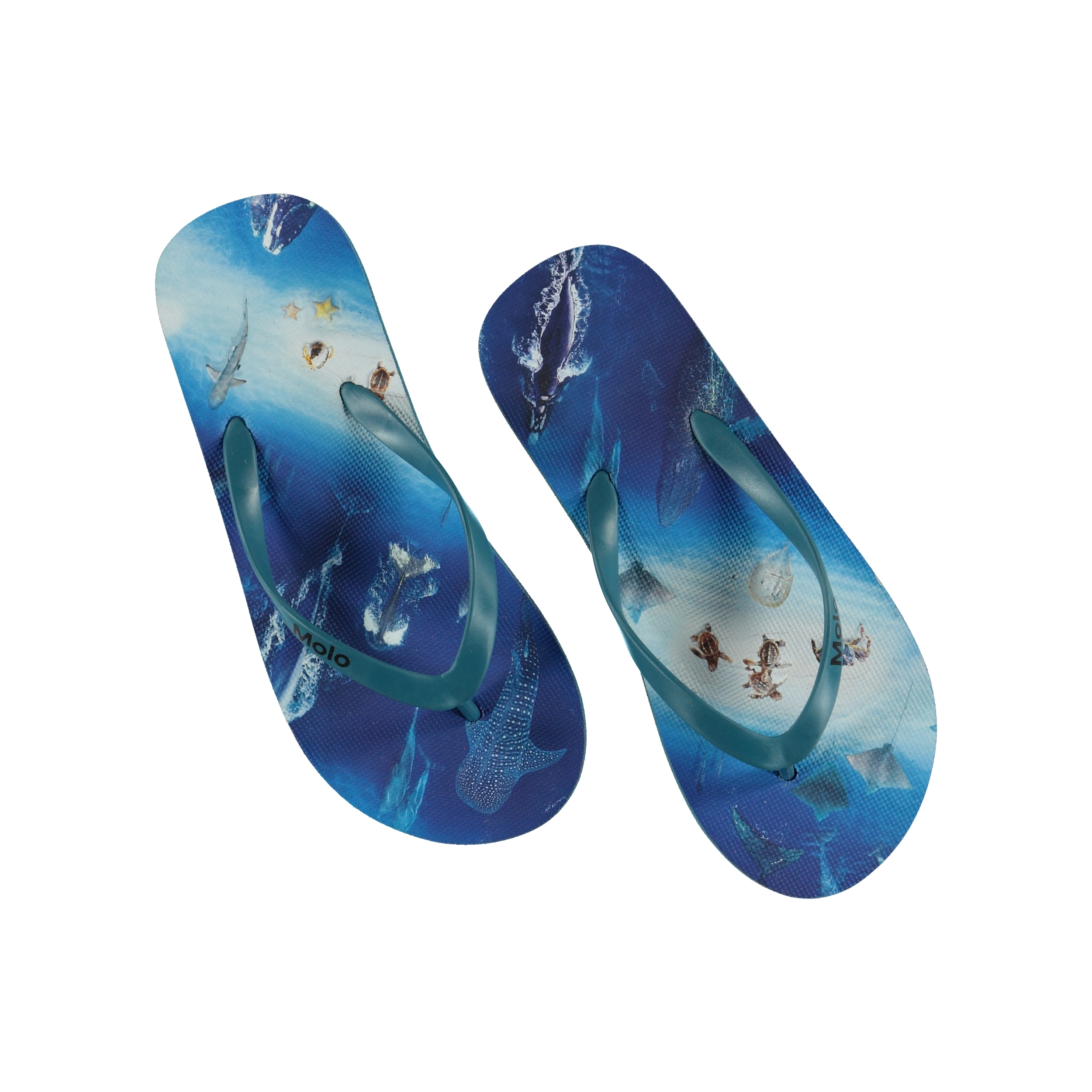 Molo's Zeppo sandaler är ett must i sommarvärmen. Flip-flops i blått med tryck av havet.