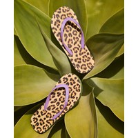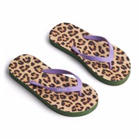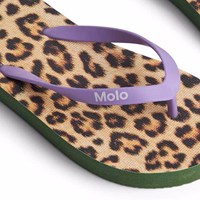 Flip-flops med gepardtryck, mjuk skumsula och lila plastremmar. Trycket på flip-flopsen matchar perfekt Molos badkläder.