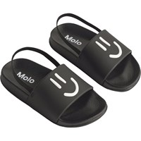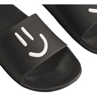 Svarta badtofflor med en vit smiley, bred fotrem och formad innersula. Vattenavvisande och idealiska för pool och strand. Storlekarna 23/24 och 25/26 har en hälrem som säkerställer en stabil passform för de minsta.