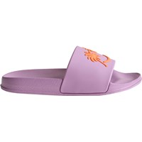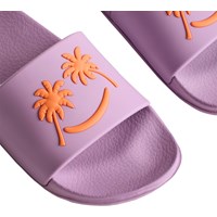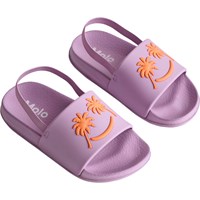 Lila badtofflor med orange palmträd som ögon och ett leende, bred fotrem och formad innersula. Vattenavvisande och idealiska för pool och strand. Storlekar 23/24 och 25/26 har en hälrem som säkerställer en stabil passform för de minsta.