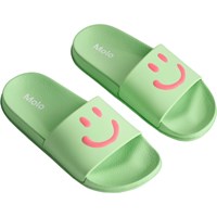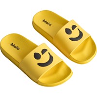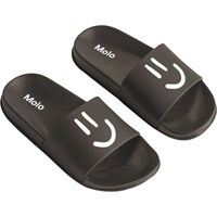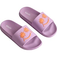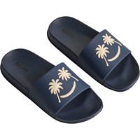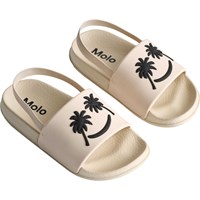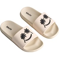 Gräddfärgade badtofflor med svarta palmer som ögon och ett leende, bred fotrem och formad innersula. Vattenavvisande och idealiska för pool och strand. Storlekarna 23/24 och 25/26 har en hälrem som säkerställer en stabil passform för de små.
