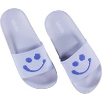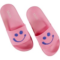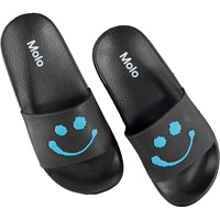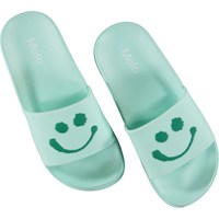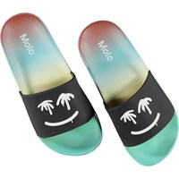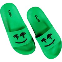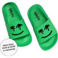 Gröna badsandaler med svart emoji med palmögon. Sandalerna tål vatten och är därför perfekta att ha med till poolen eller på stranden.