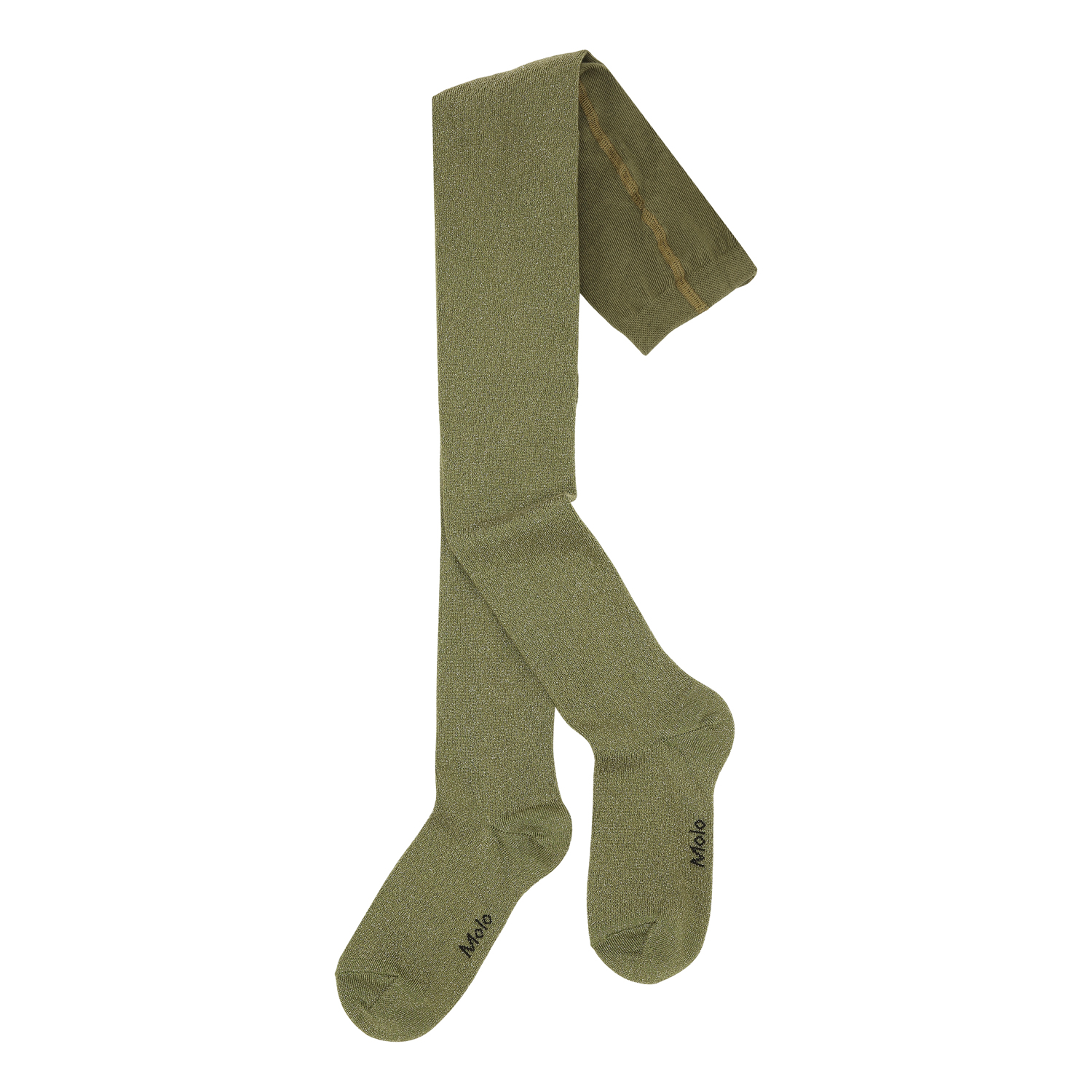Ett par strumpbyxor i armygrön med glitter. Molo´s logga är invävd under fötterna.