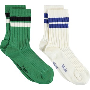 Två par par strumpor i vit och grön ribb. Det vita paret har blå ränder på skaftet, och det gröna paret har sportiga svarta och vita ränder.