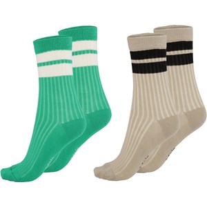 Två par ribbade sportiga strumpor. Ett par strumpor är i gröna med vita ränder, medan det andra paret är beiga med svarta ränder.