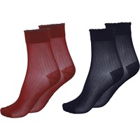 Två par strumpor med en fin kant. Ett mörkrött par, och ett mörkblått.