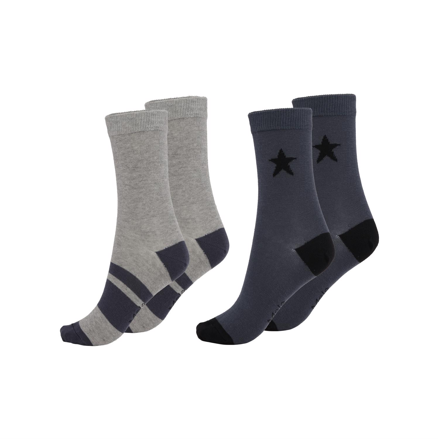 Två par strumpor i blått och grått. Ett par med en stickad stjärna och det andra med ränder.