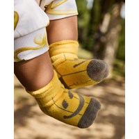 2-pack babysockor i viskos. Strumporna är vita med glada frukter och gula med ränder och smileys.