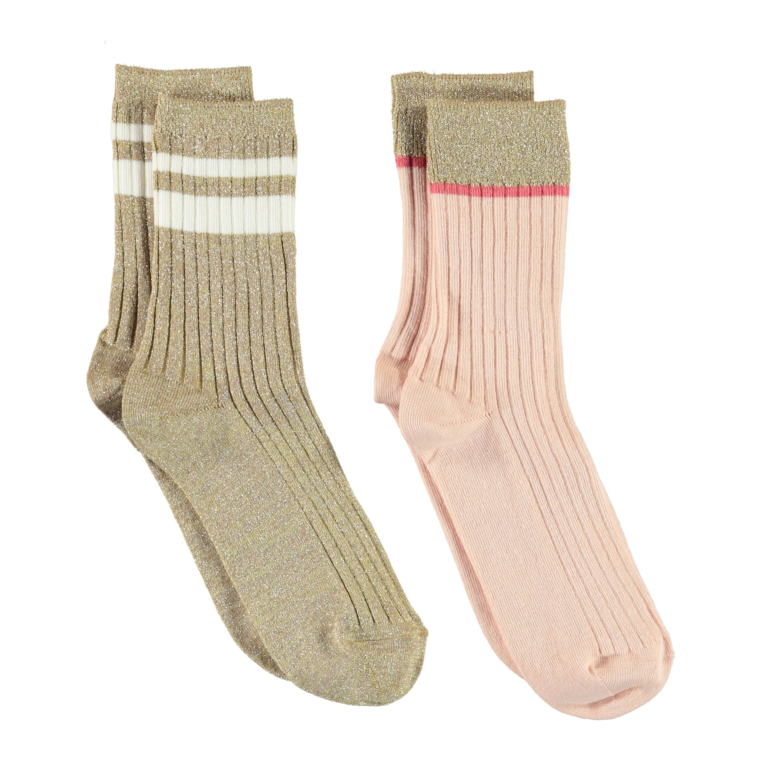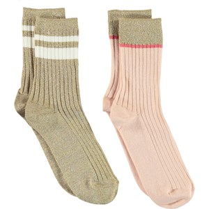 Två par strumpor i ljusrosa och guld färgad ribb.