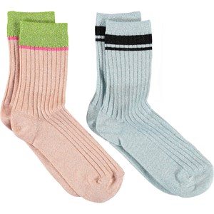Två par strumpor i ljusrosa och ljusblå ribb med ränder på skaftet.