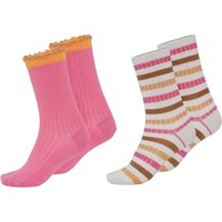 Två par ankelstrumpor i ribb. Det ena paret är rosa med orange vågad kant och det andra är vitt med tunna rosa, bruna och orange ränder.