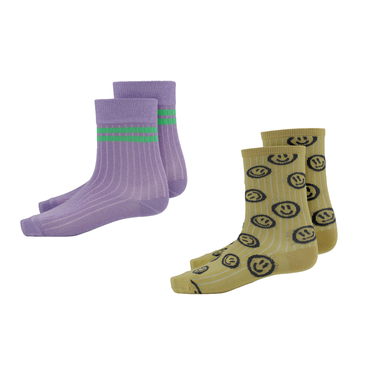 Två par strumpor. Det ena paret är i ribb och är lila med två gröna ränder vid ankeln. Det andra paret är currygula med smileys på.